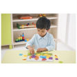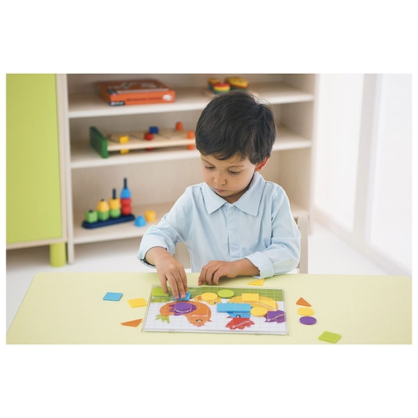 Χρωματιστά γεωμετρικά σχήματα που κουμπώνουν πάνω σε μια διάφανη πλάκα η οποία τοποθετείται πάνω σε κάρτες-μοντέλα. Το σετ περιλαμβάνει 2 διαφανείς πλαστικές πλάκες (27,4x21cm), 6 κάρτες-μοντέλα διπλής όψεως (27x20cm) και 54 πλαστικά γεωμετρικά σχήματα σε 3 σχήματα και 6 χρώματα.
