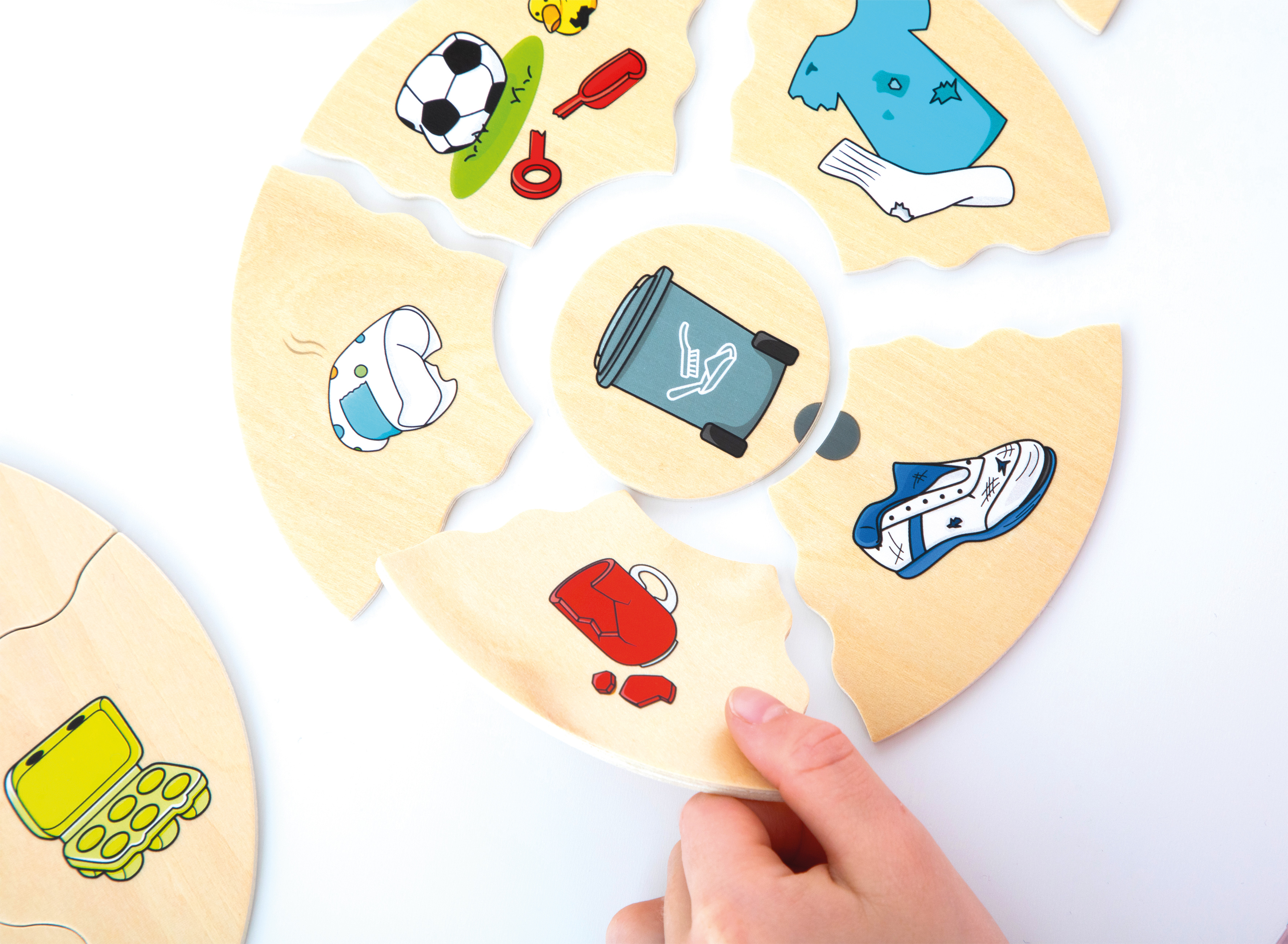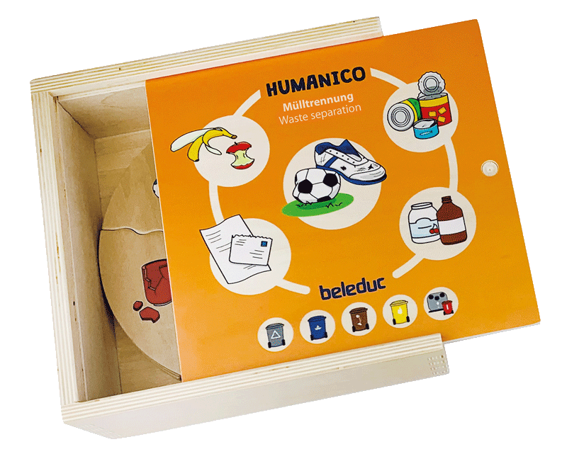 Το Beleduc 11558 Humanico – Διαλογή Σκουπιδιών είναι ένα εκπαιδευτικό σετ που περιλαμβάνει 5 ξύλινα παζλ, 6 κομμάτια το καθένα, με θέμα την διαλογή απορριμμάτων σε κατηγορίες (πλαστικό, χαρτί, γυαλί, μέταλλο, οργανικά). Βοηθά τα παιδιά να ευαισθητοποιηθούν για την προστασία του περιβάλλοντος και την ανακύκλωση, μέσα από παιχνίδι και οπτική αναγνώριση. Με σύστημα αυτοδιόρθωσης, τα παιδιά μαθαίνουν να διορθώνουν τα λάθη τους μόνα τους — ιδανικό για παιδιά από 3 ετών και άνω, ασφαλές, φιλικό στο περιβάλλον και πλούσιο σε εκπαιδευτικό περιεχόμενο.