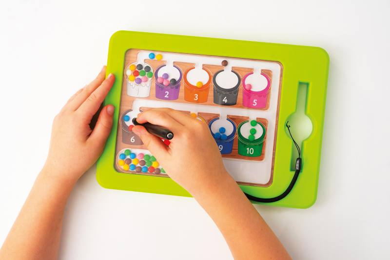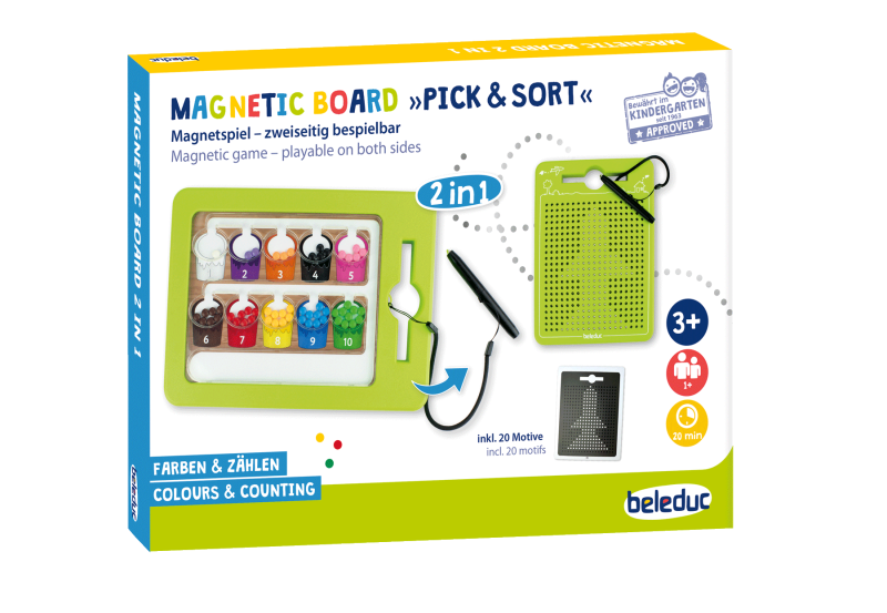 Γιατί να διαλέξετε ένα παιχνίδι, όταν μπορείτε να έχετε δύο στην ίδια συσκευασία; Το 'Μαγνητικό Παιχνίδι Διπλής Όψης' της Beleduc προσφέρει ατελείωτες ώρες δημιουργικής απασχόλησης. Στη μία πλευρά, χρησιμοποιήστε το μαγνητικό στυλό για να 'ανεβάσετε' τις μεταλλικές μπίλιες στην επιφάνεια και να δημιουργήσετε εντυπωσιακά σχέδια — όταν τελειώσετε, απλώς σκουπίστε τον πίνακα και οι μπίλιες θα 'εξαφανιστούν' μαγικά! Γυρίστε τον πίνακα από την άλλη πλευρά και ξεκινήστε το παιχνίδι ταξινόμησης: οδηγήστε τις πολύχρωμες μπίλιες στα αντίστοιχα χρωματιστά δοχεία τους. Με 20 διαφορετικά σχέδια για να ακολουθήσετε, το παιδί σας θα εξασκήσει την υπομονή, την παρατηρητικότητα και τη λεπτή του κινητικότητα, μετατρέποντας τη μάθηση των χρωμάτων στην πιο διασκεδαστική εμπειρία!
