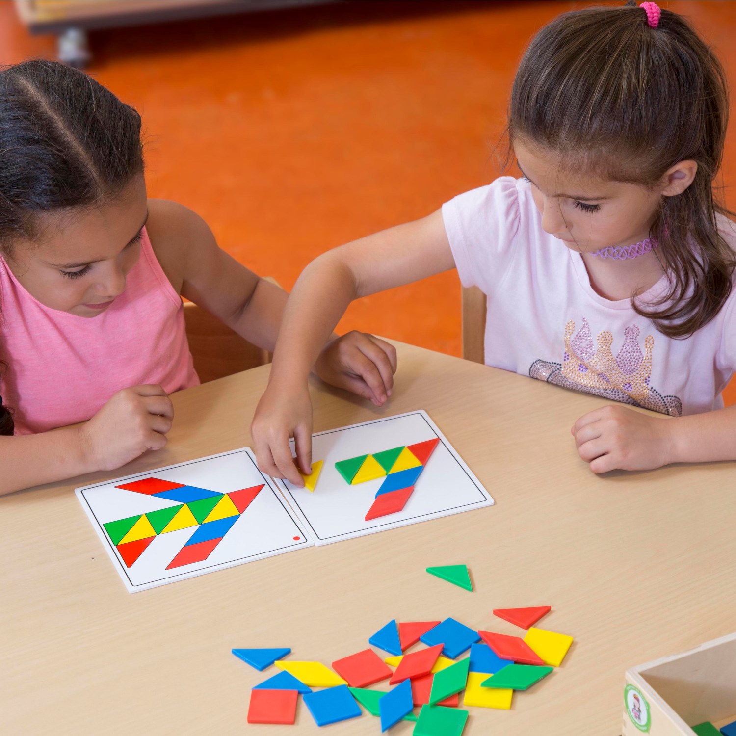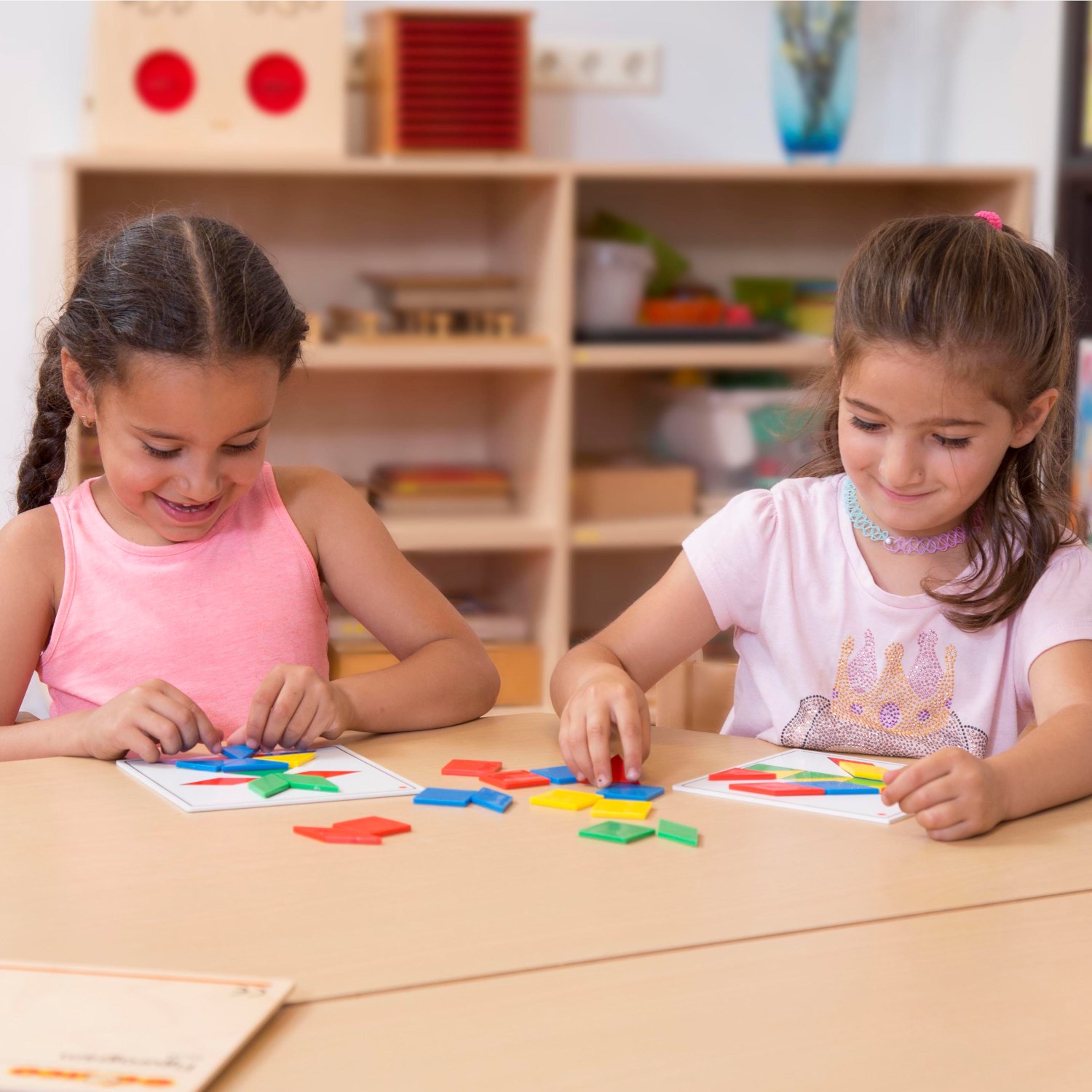 Αντικατοπτρισμοί, περιστροφές, τοποθέτηση, κατασκευή. Ανακαλύψτε πώς τα κομμάτια του μωσαϊκού δημιουργούν νέα σχήματα. Η ξύλινη κασετίνα (35x19x8cm) περιλαμβάνει 1 καθρέφτη, 18 κάρτες δραστηριοτήτων, 48 χρωματιστά κομμάτια.