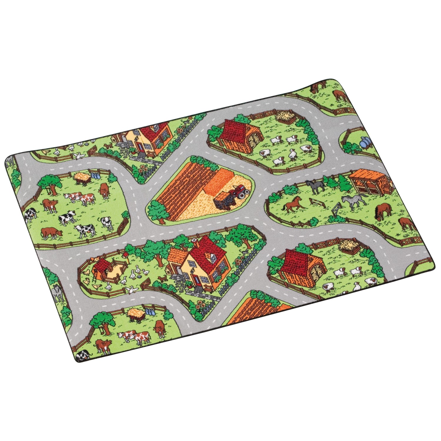Η περιπέτεια ξεκινά από το πάτωμα! Με το 'Χαλί Παιχνιδιού Φάρμα', το δωμάτιο μεταμορφώνεται σε ένα καταπράσινο τοπίο γεμάτο ζωή. Το παιδί σας μπορεί να οδηγήσει τα αγαπημένα του τρακτέρ και αυτοκινητάκια στους ελικοειδείς δρόμους, να συναντήσει αγελάδες, πρόβατα και άλογα στα λιβάδια και να ανακαλύψει κάθε γωνιά της αγροτικής ζωής. Με μεγάλη επιφάνεια 200x150cm, υπάρχει άφθονος χώρος για να παίξει μαζί με φίλους, δημιουργώντας δικές του ιστορίες και αναπτύσσοντας την κίνησή του. Είναι το ιδανικό 'γήπεδο' για τη φαντασία, όπου κάθε διαδρομή οδηγεί σε μια νέα ανακάλυψη!