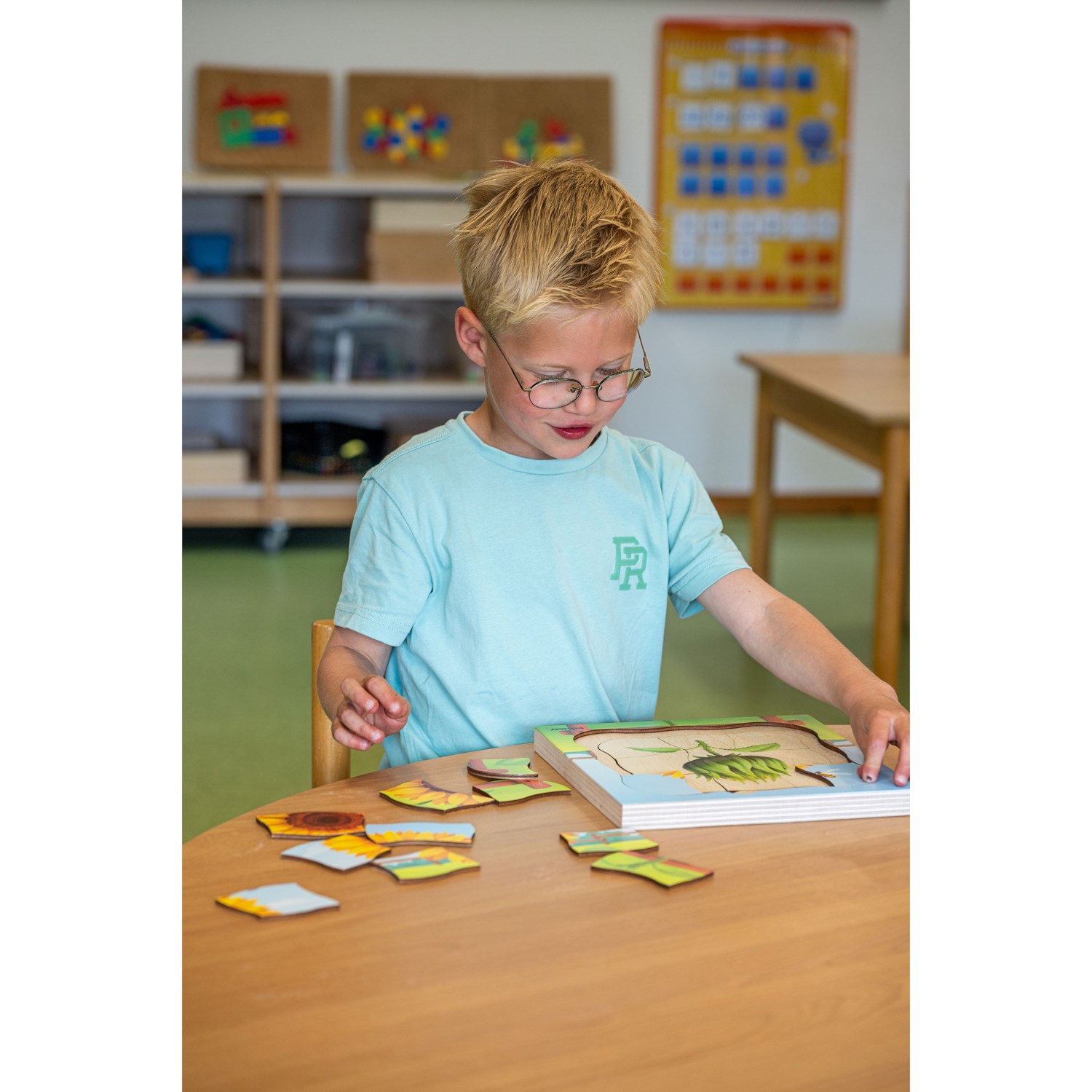 Ξύλινο παζλ (24,0x24,0x3,0cm) 4 επιπέδων και 31 κομματιών, με θέμα την εξέλιξη του ήλιου από σπόρο, σε ανθισμένο λουλούδι.