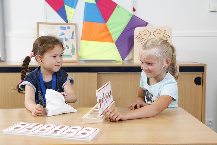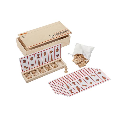 Εντοπίστε τα σχήματα που αντιστοιχούν στις εικόνες της καρτέλας, βλέποντάς τα ή αγγίζοντάς τα, μέσα στην πάνινη θήκη. Μία εικόνα δύο διαστάσεων μετατρέπεται σε ένα τρισδιάστατο σχήμα. Έτσι, αναπτύσσεται η αφή και η οπτική διάκριση. Η ξύλινη κασσετίνα (45x22x8cm) περιλαμβάνει 6 πλαστικές καρτέλες, 1 ξύλινη βάση και 64 ξύλινα σχήματα (2x32cm).