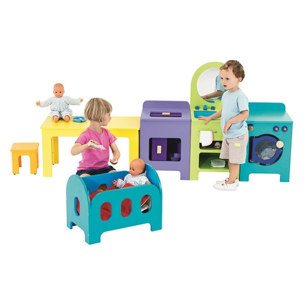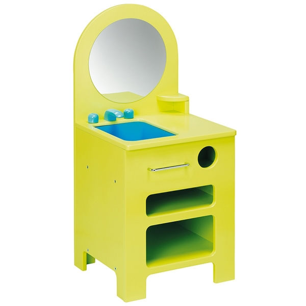 Η γωνιά του συμβολικού παιχνιδιού αποκτά έναν ολοκληρωμένο σταθμό φροντίδας όπου τα παιδιά μπορούν να πλύνουν, να αλλάξουν και να ντύσουν τις κούκλες τους με απόλυτη οργάνωση και ρεαλισμό. Κατασκευασμένη από ανθεκτικό MDF πάχους 15mm σε δροσερό πράσινο φινίρισμα, η μονάδα Vitamin 371225 συγκεντρώνει όλες τις απαραίτητες λειτουργίες σε ένα συμπαγές έπιπλο, διαθέτοντας έναν νιπτήρα με βρύση και δύο περιστρεφόμενα κουμπιά που ενισχύουν την απτική εμπειρία. Τα παιδιά έχουν τη δυνατότητα να οργανώσουν τα ρούχα της κούκλας στα δύο ευρύχωρα ράφια, ενώ ο ενσωματωμένος άθραυστος καθρέφτης επιτρέπει τη διαρκή παρατήρηση των κινήσεών τους με απόλυτη ασφάλεια. Με διαστάσεις 38x38x86cm, το έπιπλο προσφέρει έναν σταθερό σταθμό δράσης που καλλιεργεί την ενσυναίσθηση και τη λεπτή κινητικότητα, επιτρέποντας στη φαντασία να ανθίσει μέσα από τη μίμηση των καθημερινών τελετουργικών φροντίδας.