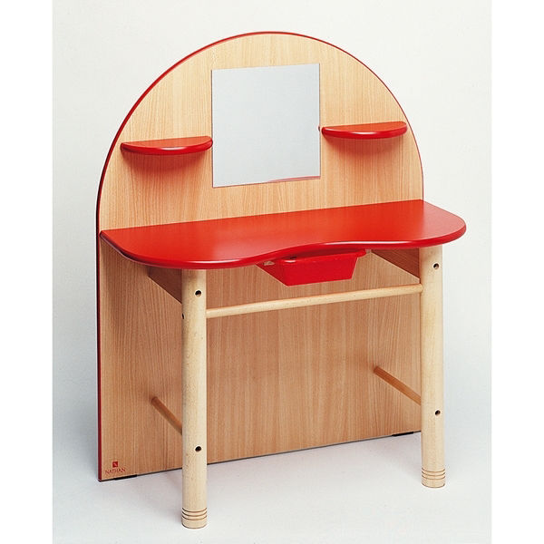 Η προετοιμασία για την επόμενη μεγάλη παράσταση ή το παιχνίδι των μεταμφιέσεων αποκτά τον δικό της σταθμό με αυτήν την καλαίσθητη τουαλέτα-κομμωτήριο της Nathan. Ο σχεδιασμός της συνδυάζει τη ζεστασιά του ξύλου οξιάς με το κόκκινο χρώμα, δημιουργώντας ένα σημείο αναφοράς. Στο κέντρο δεσπόζει ο καθρέφτης, ο οποίος πλαισιώνεται από δύο πρακτικά ράφια σε κάθε πλευρά, προσφέροντας τον τέλειο χώρο για να εκθέσουν οι μικροί δημιουργοί τις βούρτσες, τα αξεσουάρ μαλλιών ή τα φανταστικά τους καλλυντικά. Το ενσωματωμένο πλαστικό συρτάρι στο κάτω μέρος προσφέρει επιπλέον κρυφό αποθηκευτικό χώρο, βοηθώντας τα παιδιά να διατηρούν τη γωνιά τους τακτοποιημένη μετά από κάθε «μεταμόρφωση». Με διαστάσεις 75x33x52cm και προσεκτικά στρογγυλεμένες γωνίες, το έπιπλο διασφαλίζει μια άνετη και ασφαλή εμπειρία παιχνιδιού, ενισχύοντας την αυτοπεποίθηση και την κοινωνική αλληλεπίδραση μέσα από τη μίμηση καθημερινών συνηθειών ομορφιάς.
