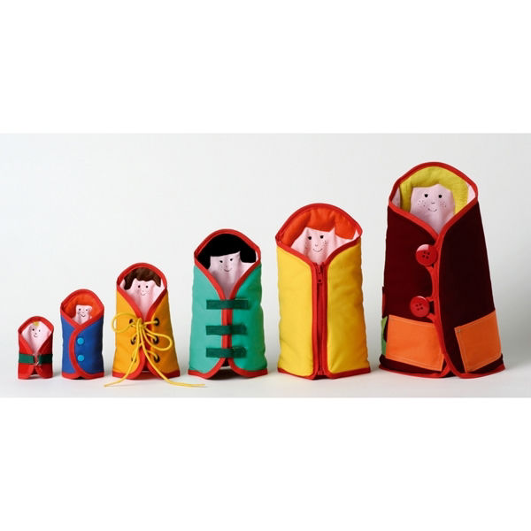 Από τη μεγαλύτερη των 35cm μέχρι τη μικρότερη των 10cm, κάθε κούκλα διαθέτει ένα διαφορετικό δέσιμο: κουμπιά, φερμουάρ, velcro, κορδόνια ή ζώνη. Τα παιδιά λατρεύουν να τις ανοίγουν, να τις κλείνουν και να τις τοποθετούν όρθιες στη σειρά, αναπτύσσοντας με απόλυτα φυσικό τρόπο τη λεπτή τους κινητικότητα και την υπομονή τους. Είναι το ιδανικό παιχνίδι για να μάθουν να ντύνονται μόνα τους, μέσα από μια τρυφερή και πολύχρωμη αγκαλιά που αντέχει στον χρόνο.
