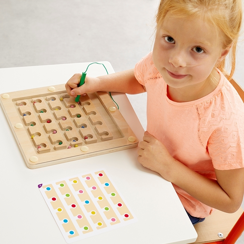 Η προετοιμασία για τη γραφή γίνεται μια μαγνητική περιπέτεια! Το Nathan 387284 Magneticolor είναι ένα υψηλής ποιότητας ξύλινο παιχνίδι που προσκαλεί τα παιδιά να εξασκήσουν την υπομονή και την ακρίβεια των κινήσεών τους. Χρησιμοποιώντας τη μαγνητική πένα, οι μικροί μαθητές οδηγούν τις χρωματιστές μπίλιες μέσα από τις διαδρομές για να τις τοποθετήσουν στη σωστή θέση, αναπτύσσοντας τον συντονισμό χεριού-ματιού και τη λαβή που απαιτείται για το γράψιμο. Το σετ περιλαμβάνει 12 κάρτες δραστηριοτήτων διπλής όψεως με προτεινόμενα μοτίβα, ενώ ενθαρρύνει και την ελεύθερη δημιουργία, προσφέροντας μια ήρεμη και απόλυτα συγκεντρωμένη εμπειρία μάθησης. Η κλειστή επιφάνεια εξασφαλίζει ότι καμία μπίλια δεν χάνεται, καθιστώντας το ιδανικό για ατέλειωτες ώρες εξάσκησης στο σπίτι ή στις μετακινήσεις.