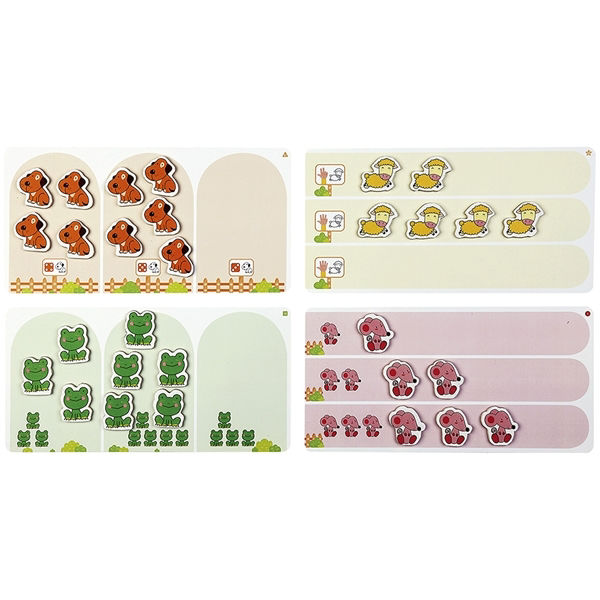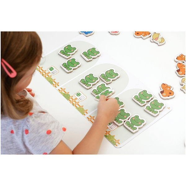 Το σετ περιλαμβάνει 24 μαγνητικές κάρτες δραστηριοτήτων και 72 μαγνητάκια, τα οποία παραμένουν σταθερά στη θέση τους, διευκολύνοντας τον χειρισμό από τα μικρά χέρια. Η μάθηση βασίζεται στην πολυαισθητηριακή προσέγγιση της Nathan: οι ποσότητες αναπαρίστανται με εικόνες, δάχτυλα, κουκκίδες και ζάρια, βοηθώντας το παιδί να κατανοήσει τη σχέση ανάμεσα στο σύμβολο και το μέγεθος. Μέσα από δραστηριότητες συλλογής, ομαδοποίησης και αλληλουχίας, οι μικροί μαθητές αναπτύσσουν τη λογική τους σκέψη και την παρατηρητικότητα, χτίζοντας γερές βάσεις για τη μετέπειτα μαθηματική τους πορεία.