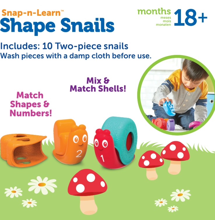 20 σαλιγκαράκια, 2 τεμαχίων το καθένα (σώμα και κέλυφος) για ταύτιση αριθμού (1-10), χρώματος και σχήματος (κύκλος, καρδιά, τρίγωνο, τετράγωνο, πεντάγωνο). Εκτός από την ταύτιση των σωστών κομματιών, μπορείτε επίσης, να φτιάξετε σαλιγκαράκια με τους δικούς σας συνδυασμούς. Είναι ιδανικά για παιχνίδι μίμησης.