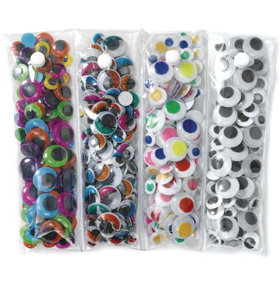 Σετ 500 αυτοκόλλητα ματάκια, χρωματιστά και μαύρα. Είναι σε πολύ πρακτική συσκευασία, που διευκολύνει την οργάνωσή τους. Διάμετρος: 1,00cm - 2,00cm